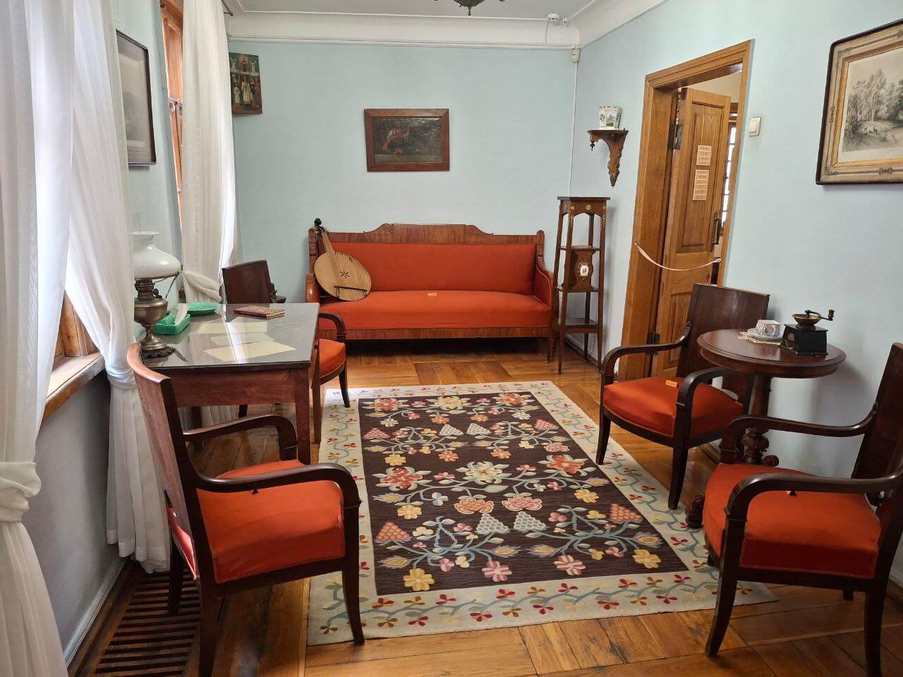 Інтер’єр кімнати відтворює атмосферу київської оселі середини XIX століття: кахляна грубка, кавомолка, народна картина «Козак Мамай», самовар. Тут звучали розмови, читалася нова література, наливалася кава — у цій тиші й світлі свічок народжувались віршовані рядки. Кожна річ на робочому столі підібрана не випадково. Чернетки творів, монети, які давав Шевченко жебракам з вікна, старовинна лампа. І куди ж без чорнильниці з двома відділами, в першому було чорнило, а в другому пісок.