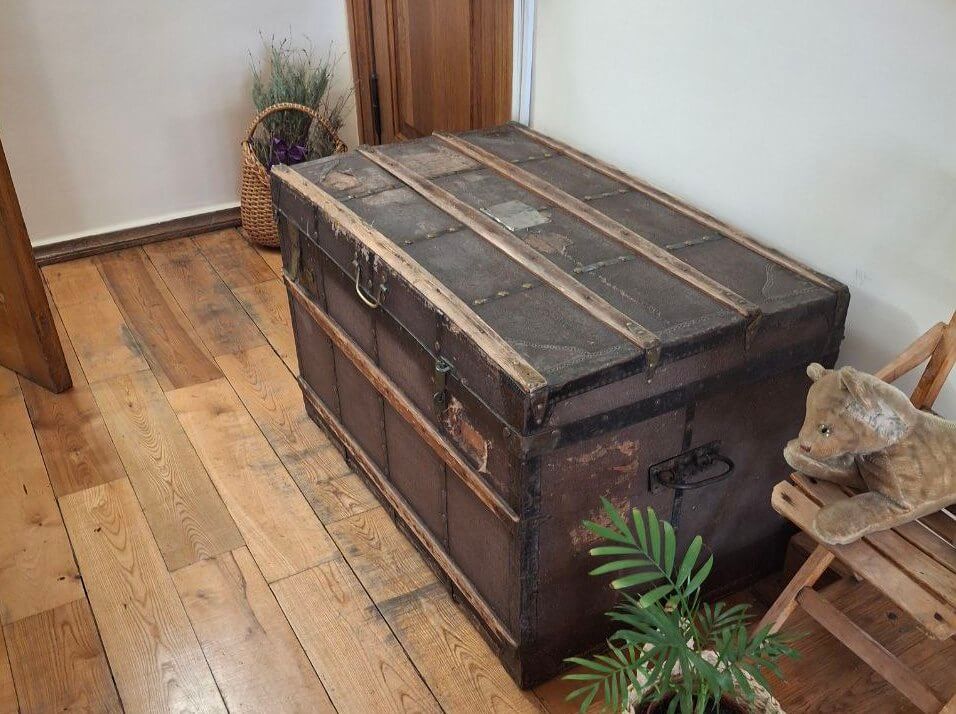 На сходовій клітині, обабіч, розміщені дві скрині. Одна з них — дорожня, незамінний атрибут мандрівника ХІХ століття. Вона має кілька відділень і пружний каркас, що допомагає зберігати форму у тривалих подорожах.