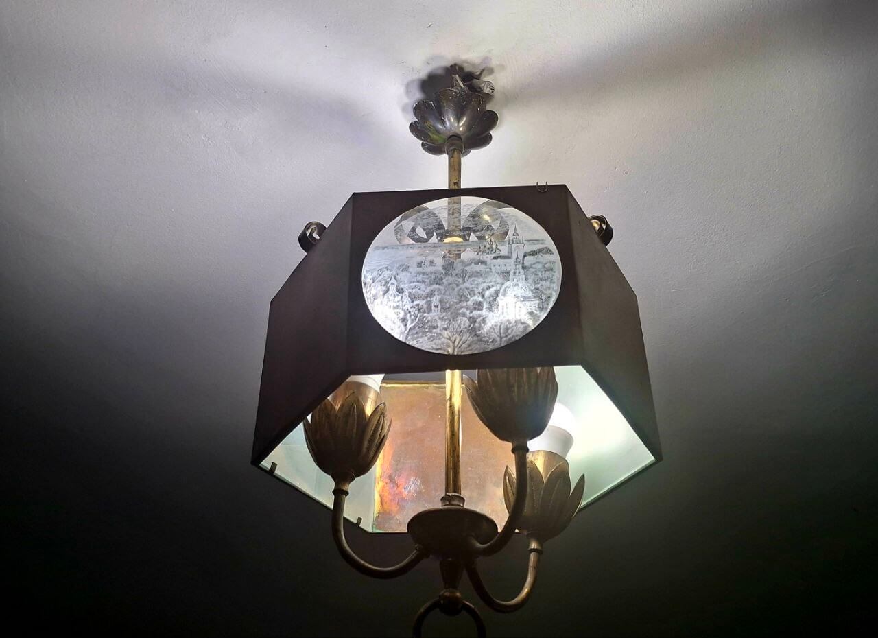 Розгляньте люстри на стелі. Яка місцевість зображена на представленій грані?